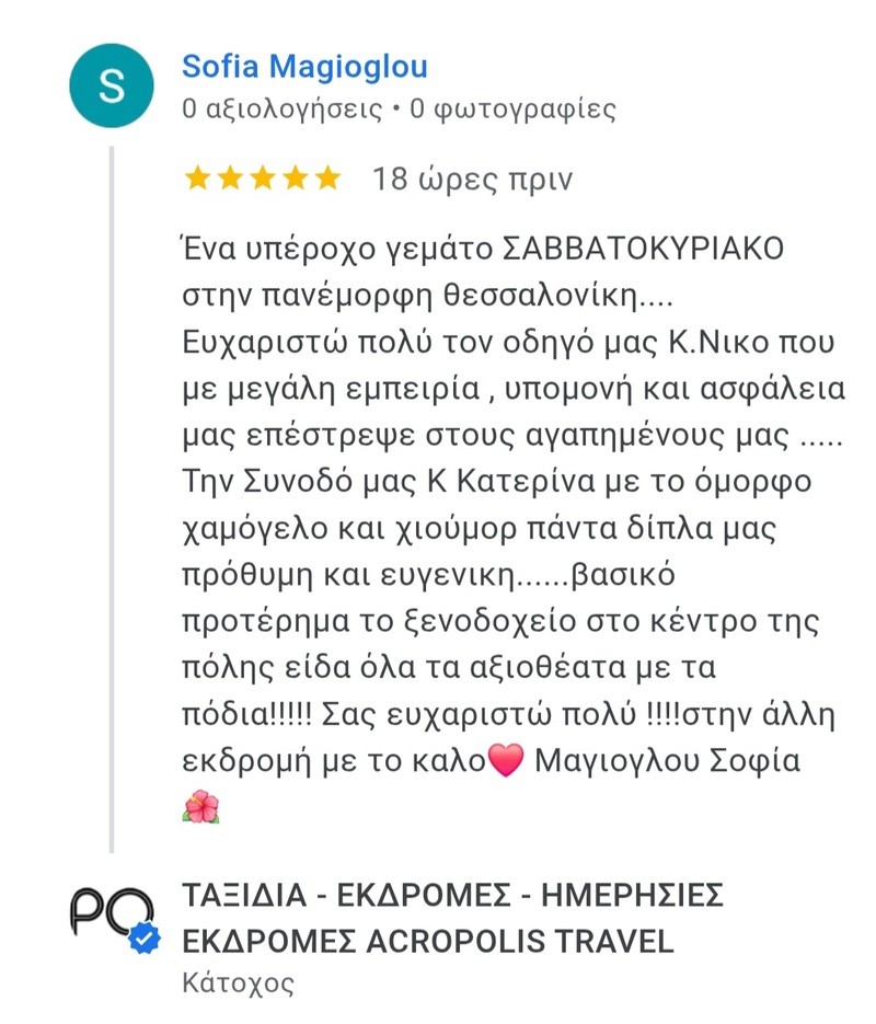 Μετά το πρωινό μας, θα ξεκινήσουμε την περιήγησή μας στην πόλη αρχικά με το Μετρό από τον σταθμό Βενιζέλου, όπου θα δούμε τμήμα της αρχαίας Εγνατίας οδού και τον σταθμό της Αγίας Σοφίας με ευρήματα από την βυζαντινή περίοδο. Μεταξύ των άλλων θα δούμε την Αψίδα του Γαλέριου, τη Ροτόντα, την Αχειροποίητο, το Ναό της Αγίας Σοφίας και πολλά άλλα αξιοθαύμαστα της συμπρωτεύουσας. Ελεύθερος χρόνος για να προμηθευτείτε τα περίφημα τρίγωνα Πανοράματος, να έχετε ένα πρόχειρο γεύμα ή ένα καφέ και νωρίς το μεσημέρι αναχωρούμε για την επιστροφή μας στην Αθήνα. Με ενδιάμεσες στάσεις για ξεκούραση.